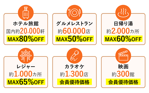 200,000以上の国内・海外宿泊、パックツアー、レジャー施設、グルメ、ショッピング、育児・介護などの豊富なサービスがラインナップされています。