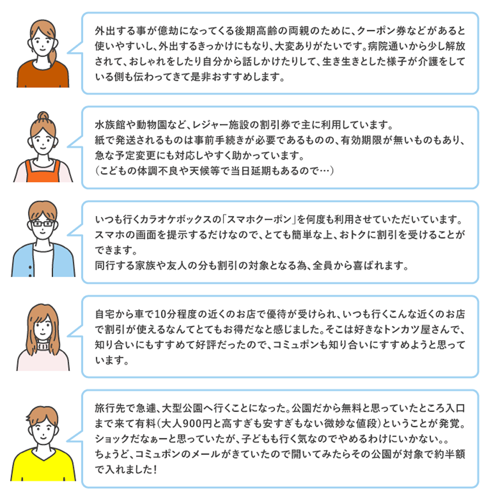コミュポンを利用している多くの方々から、サービスの便利さやおトク感について高い評価を受けています。実際の利用者さまの声を聞くと、コミュポンを利用することによって得られる満足感や楽しみが伝わってきます。