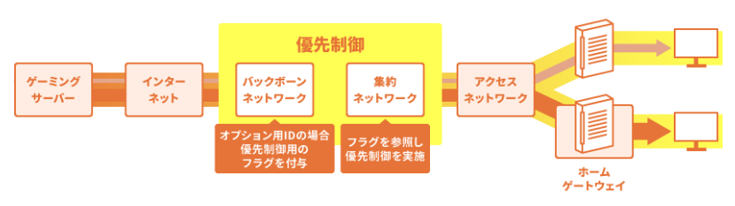 このQoS技術により、ご契約者様のご自宅に配置されたホームゲートウェイに優先制御用のフラグを立て、弊社ネットワーク内において優先利用できるサービスとして提供いたします。