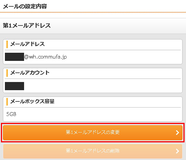 メールアカウント情報の下にある「第○メールアドレスの変更」をクリックしてください。