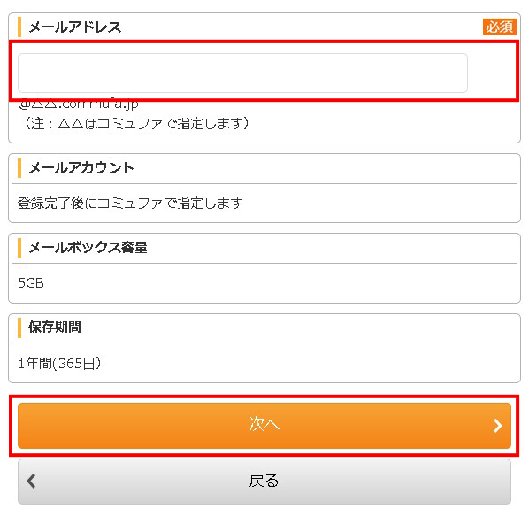 “メールアドレス”の項⽬に希望のアドレスを⼊⼒し、「次へ」を選択してください。